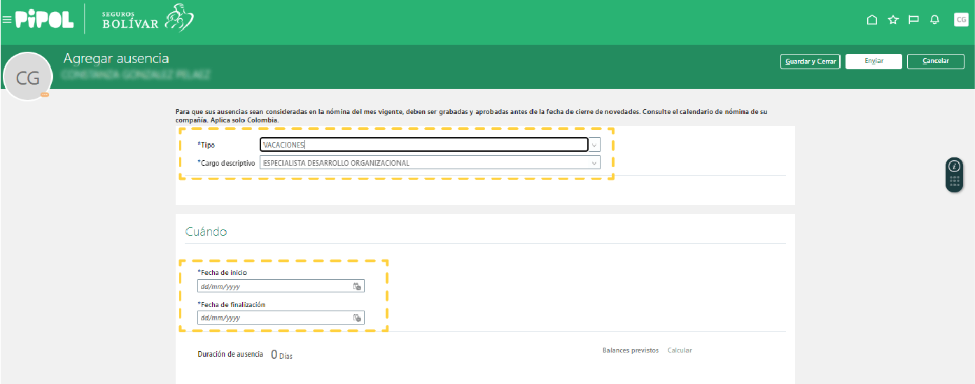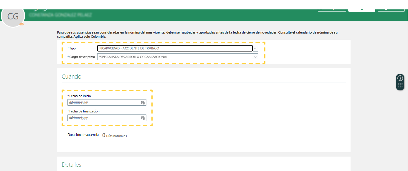Incluir los días de incapacidad y el riesgo que la origina (común o