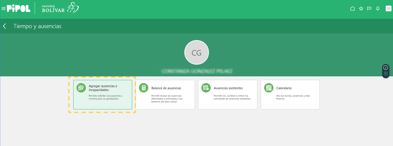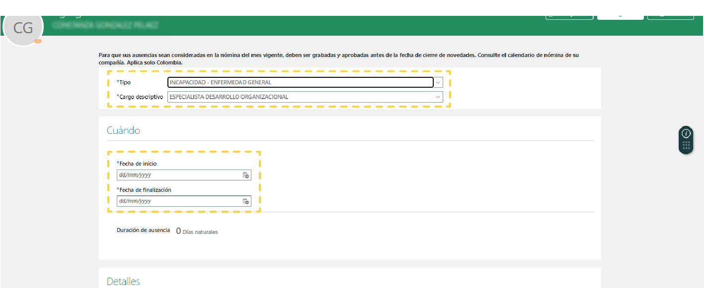 Haz clic sobre el círculo de los días en la barra lateral y desplázate sobre ella para descubrir la información de los días de incapacidad.