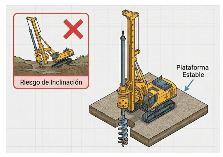 lo que resultaría en un pilote torcido. Por lo tanto, cuando se presente esta condición debe construirse una plataforma horizontal y estable. La NSR-10 fija tolerancias de ubicación y verticalidad para pilas/pilotes.