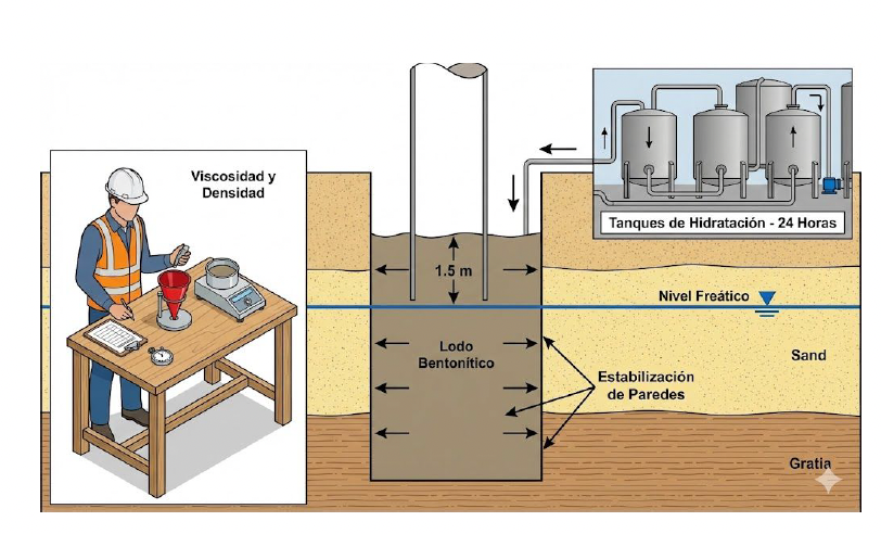 Si usas lodo bentonítico para sostener las paredes. Este lodo debe mezclarse y dejarse hidratar al menos 24 horas antes de usarse para que sus propiedades de densidad y