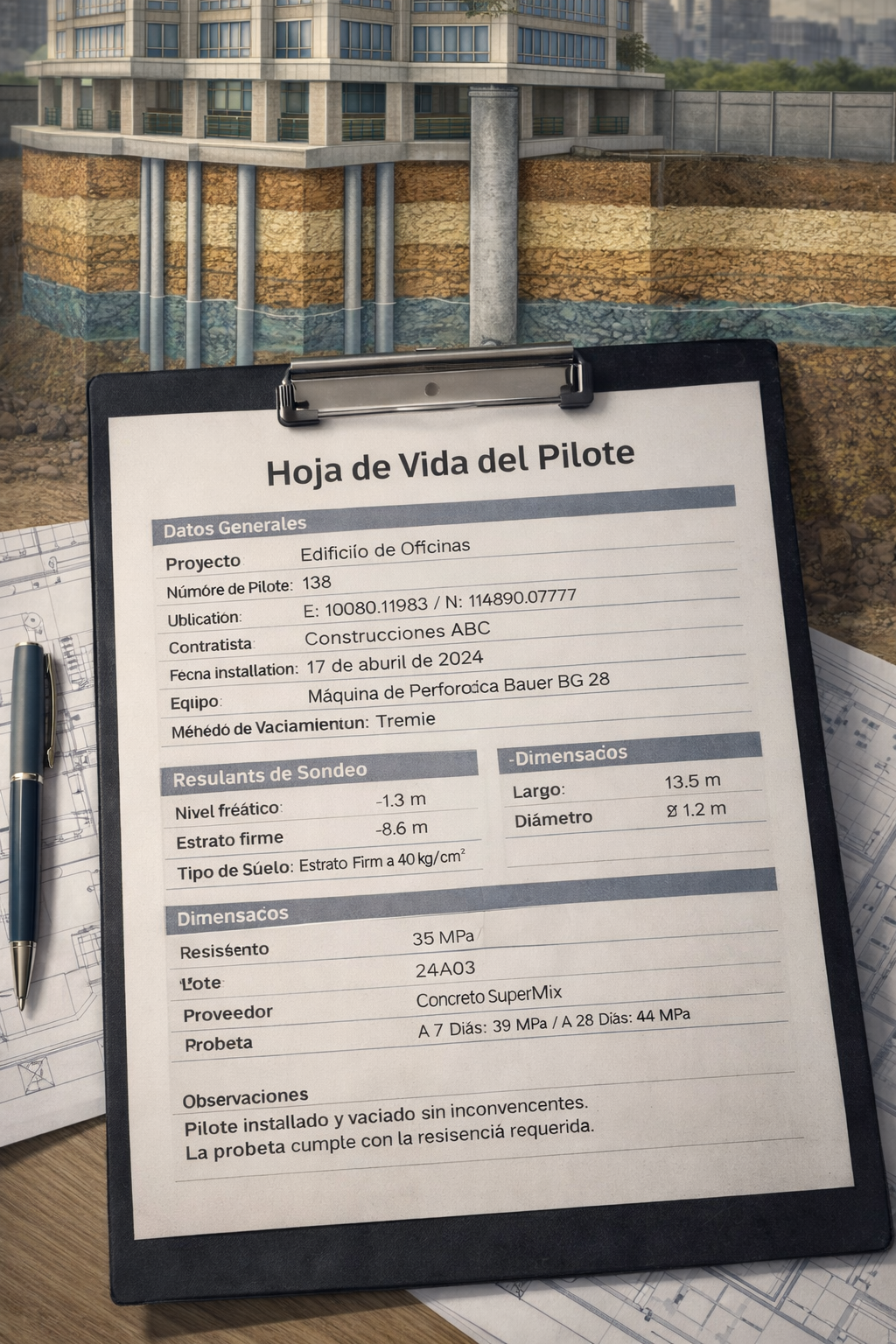 22. Por último debes llevar un registro detallado de cada pilote, incluyendo: su localización en planta, las dimensiones perforadas, fechas de perforación y vaciado, profundidad alcanzada, espesores y tipo de estratos encontrados, y características del estrato de apoyo. Esto implica que en la bitácora diaria deben consignarse los datos de cada excavación y eventuales incidencias. Este registro facilita detectar problemas (ej. un estrato distinto al previsto) y tomar decisiones informadas durante la obra. Esto es conocido como la hoja de vida del pilote.