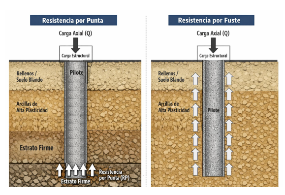 ● Resistencia por punta: El pilote se apoya directamente sobre un estrato firme (como roca o grava densa), funcionando
