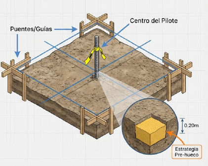 6. Realiza El Pre-hueco: excavando un pequeño agujero guía de 0.20 m de profundidad con el diámetro del pilote y se