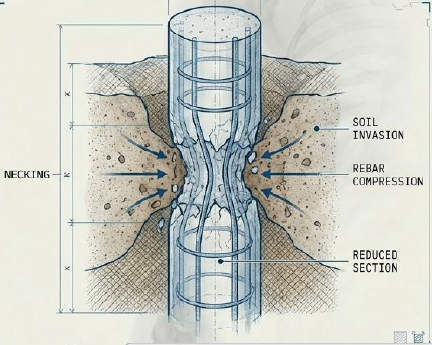 Empecemos con el Estrangulamiento del fuste. Imagina el pilote como una columna que debería conservar el mismo diámetro en toda su longitud. Sin embargo, en suelos granulares o poco cohesivos esto puede fallar: si no usamos lodo de perforación adecuado o retiramos la camisa metálica demasiado rápido sin suficiente presión de concreto, el suelo lateral invade el concreto fresco antes de que endurezca y provoca una reducción localizada del pilote.